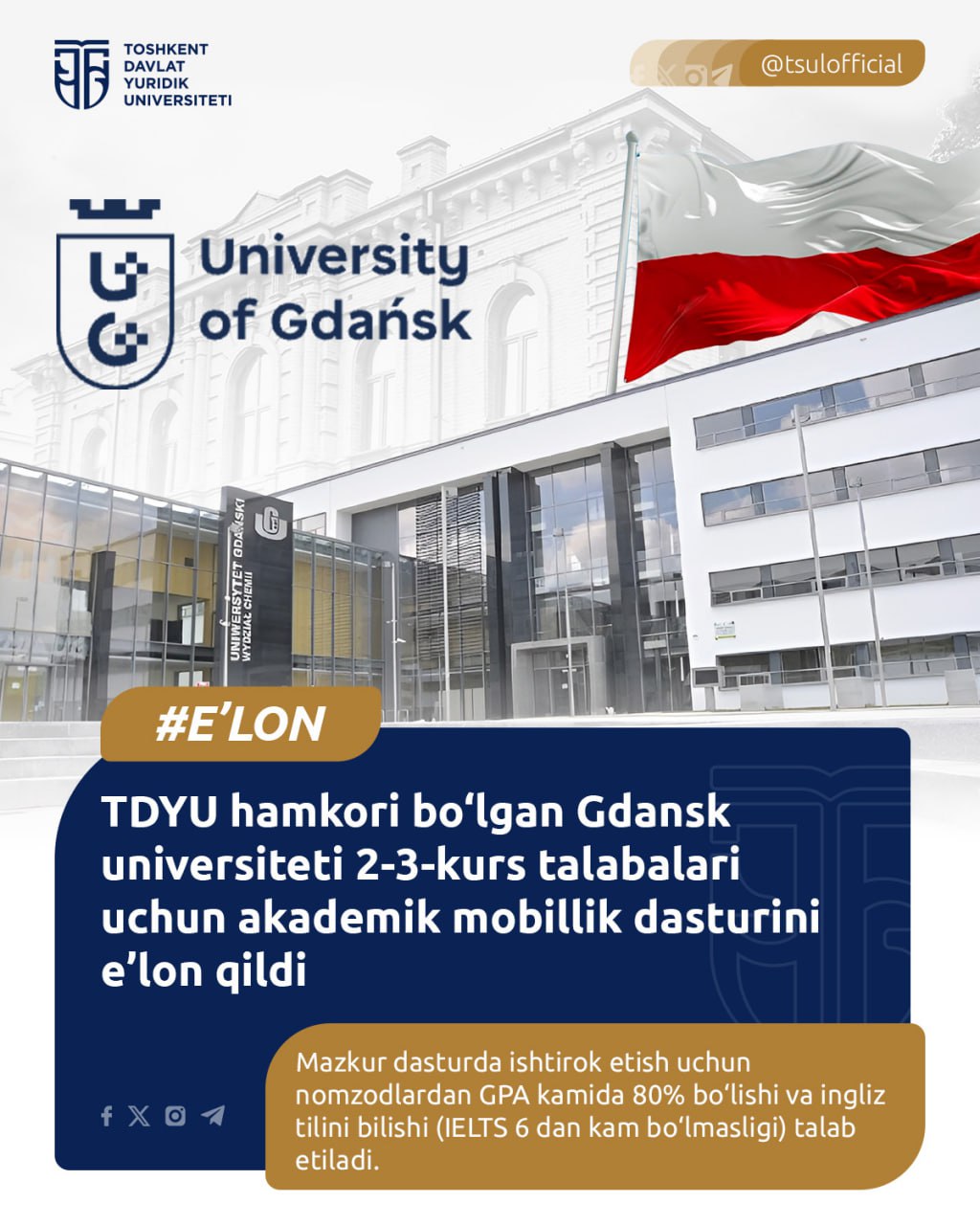 The program allows studying at the partner foreign university without paying tuition fees for the second semester of the 2025/2026 academic year. However, if the student is enrolled at TSUL on a fee basis, the tuition fee and all other expenses (transportation, visa, insurance, accommodation) must be covered by the student.