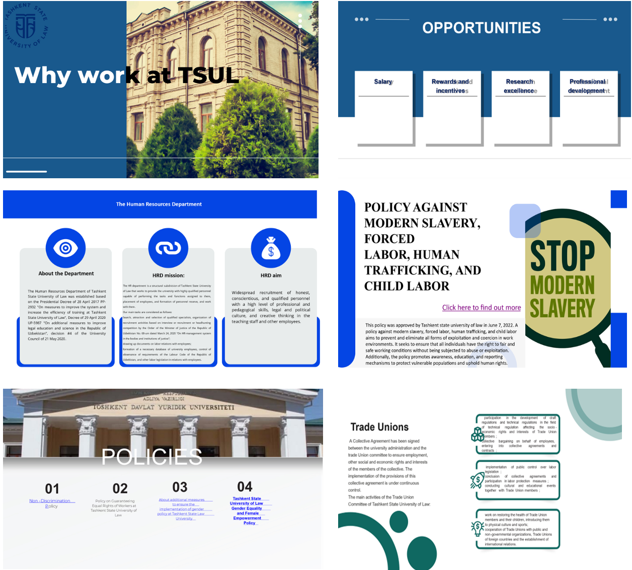 The Tashkent State University of Law is firmly committed to maintaining a workplace free from discrimination and sexual harassment. A comprehensive set of internal regulations, including the Equality, Diversity, and Inclusion Policy, alongside the Policy on Guaranteeing Equal Rights of Workers, Gender Equality Policy, Policy Against Modern Slavery, Forced Labor, Human Trafficking, and Child Labor, Gender Equality and Female Empowerment Policy, reinforces this commitment and further promotes equal pay, decent work, and professional growth opportunities for all employees.