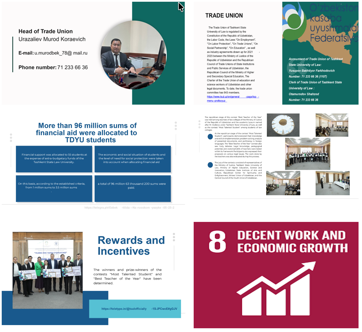 In alignment with Sustainable Development Goal 8 “Decent Work and Economic Growth”, the Tashkent State University of Law (TSUL) actively promotes inclusive and sustainable economic growth, productive employment, and decent work for all. TSUL has formal mechanisms to ensure fair remuneration and decent work conditions for all staff (academic and non-academic).