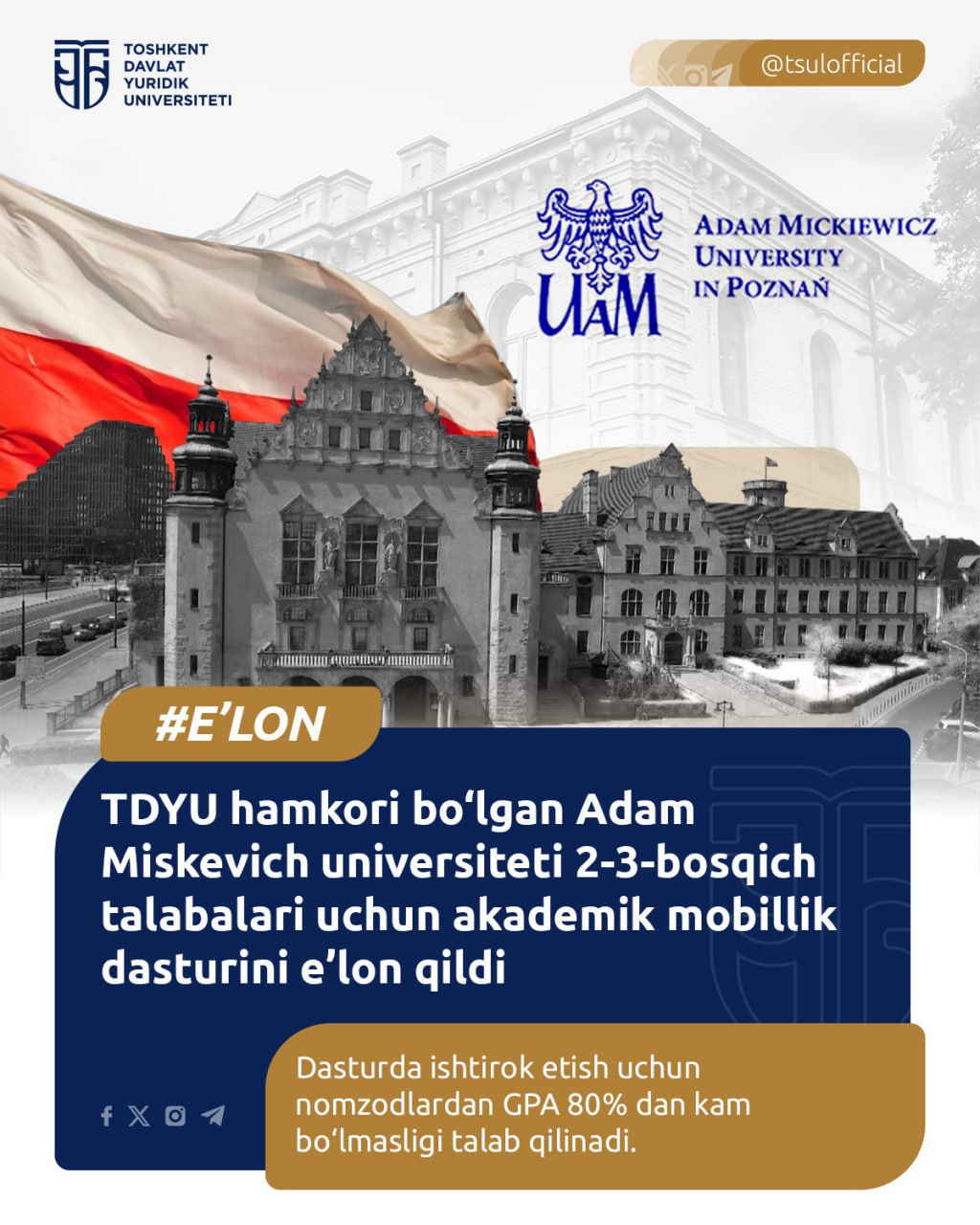Partner of TGU — Adam Mickiewicz University announces an academic mobility program for 2nd and 3rd-year students of TSUL.