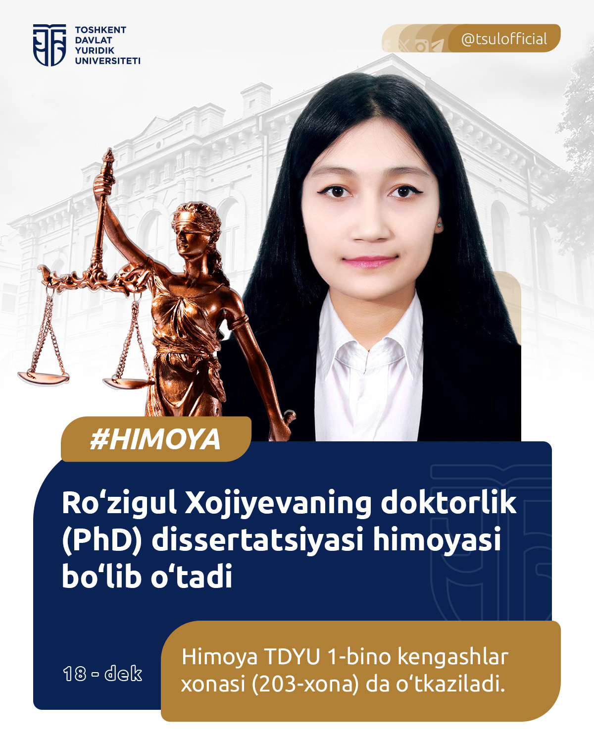 18 декабря в 16:00 на заседании Научного совета DSc.07/13.05.2020.Yu.22.03 при Ташкентском государственном юридическом университете состоится защита диссертации на соискание ученой степени доктора философии по юридическим наукам (PhD) Xoжиевой Рузигул Xудайбердиевна на тему « Совершенствование уголовного законодательства, устанавливающего ответственность за посредничество во взяточничестве» по специальности 12.00.08 – Уголовное право. Уголовно-исполнительное право.