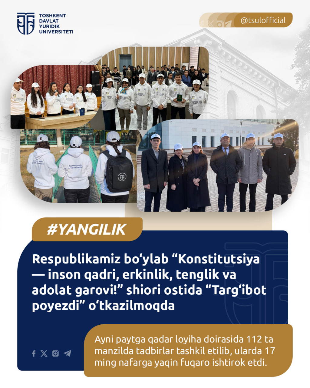 В рамках проекта, организованного Министерством юстиции совместно с Ташкентским государственным юридическим университетом в целях глубокого разъяснения населению, особенно молодежи, сути и значения Конституции Республики Узбекистан, повышения их правовой грамотности и укрепления правовой культуры, студенты, магистранты и ответственные сотрудники ТГЮУ совместно с территориальными органами юстиции проводят просветительские мероприятия.