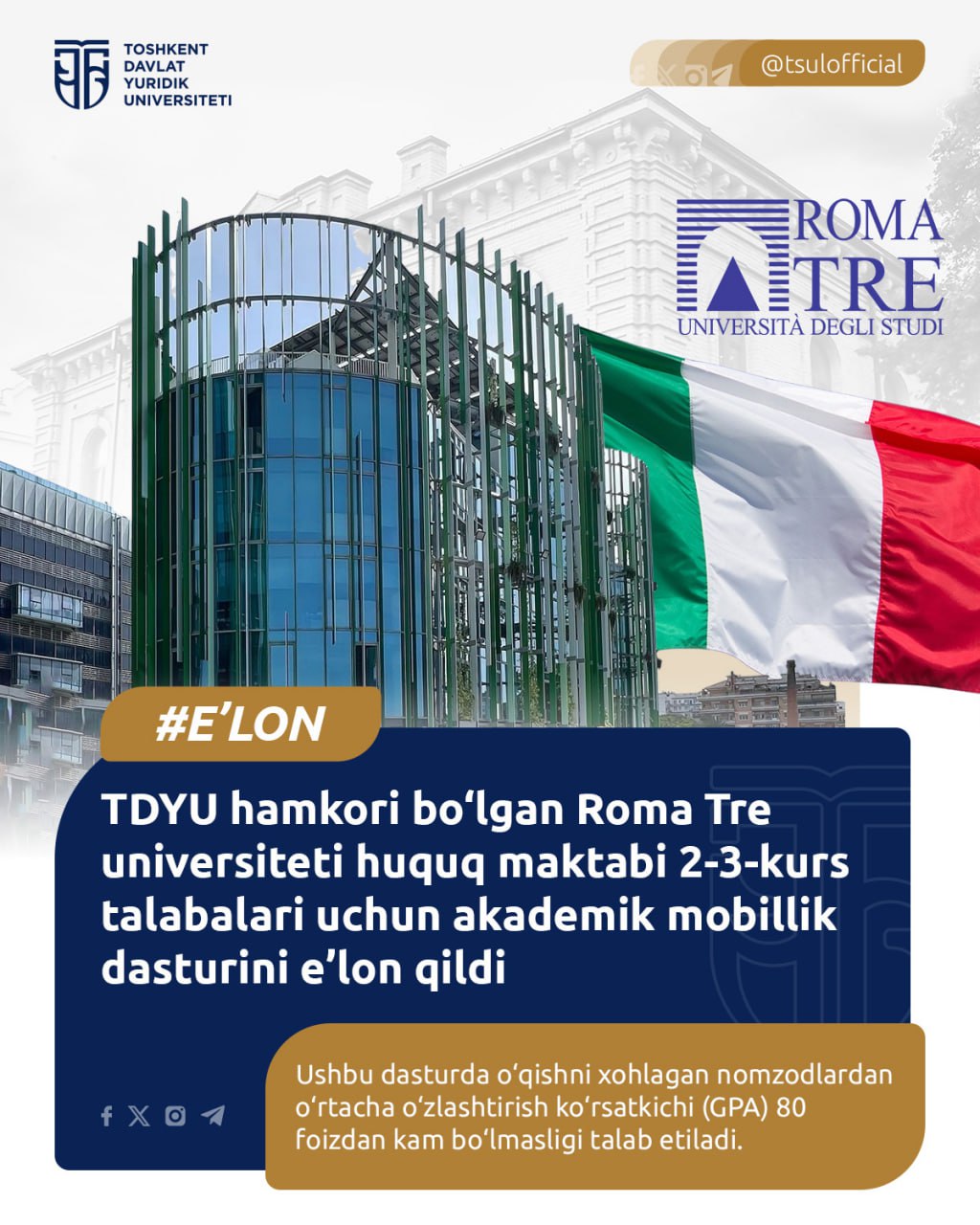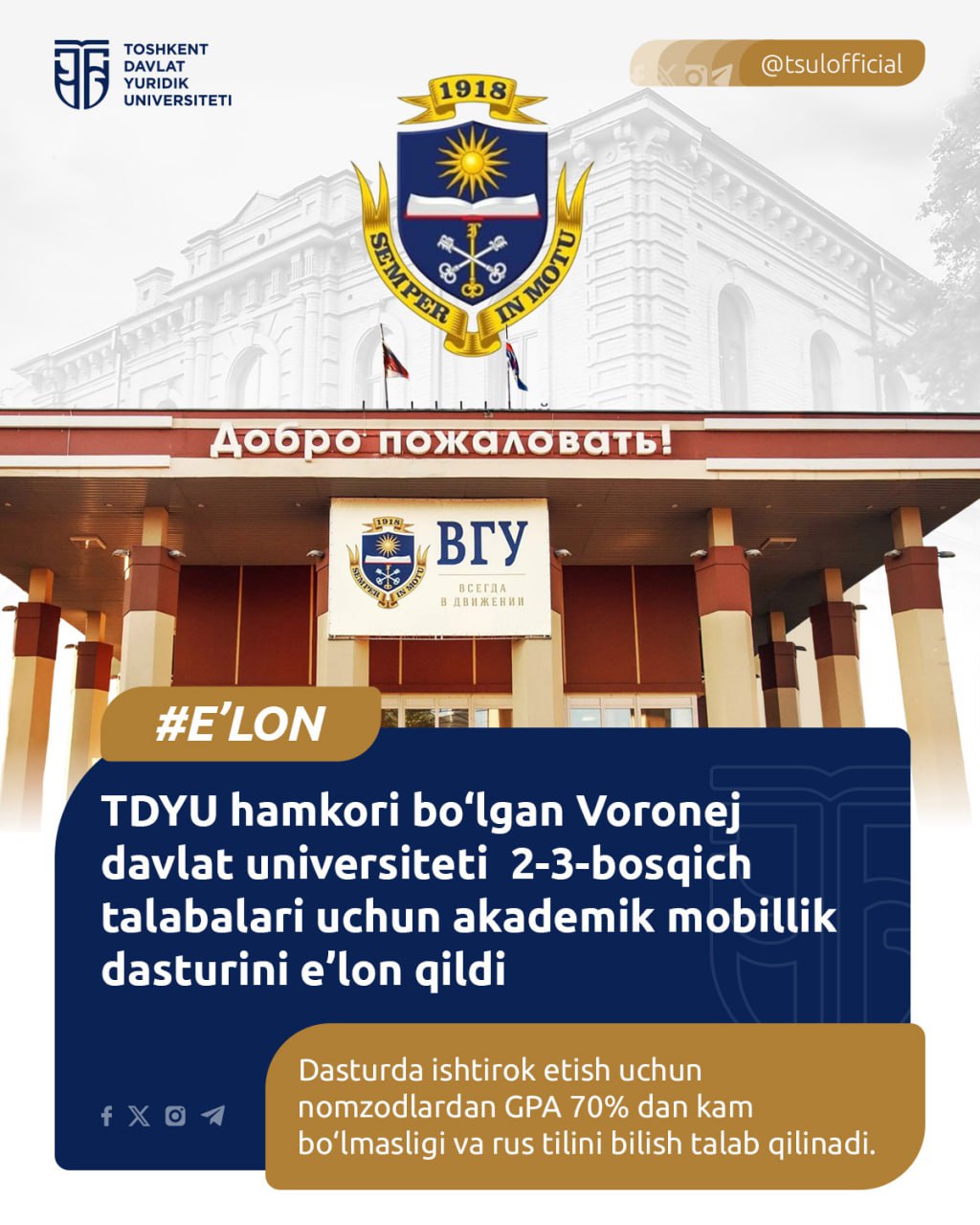 Xorijiy universitetda akademik mobillik dasturida ishtirok etishni istagan talabalar quyidagi hujjatlarni 1-dekabrga qadar fakultet dekanatlariga topshirishi lozim: