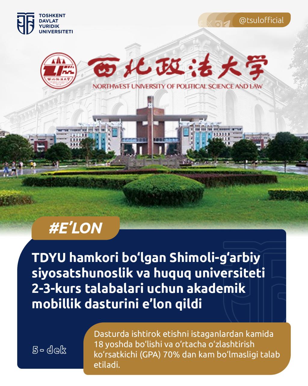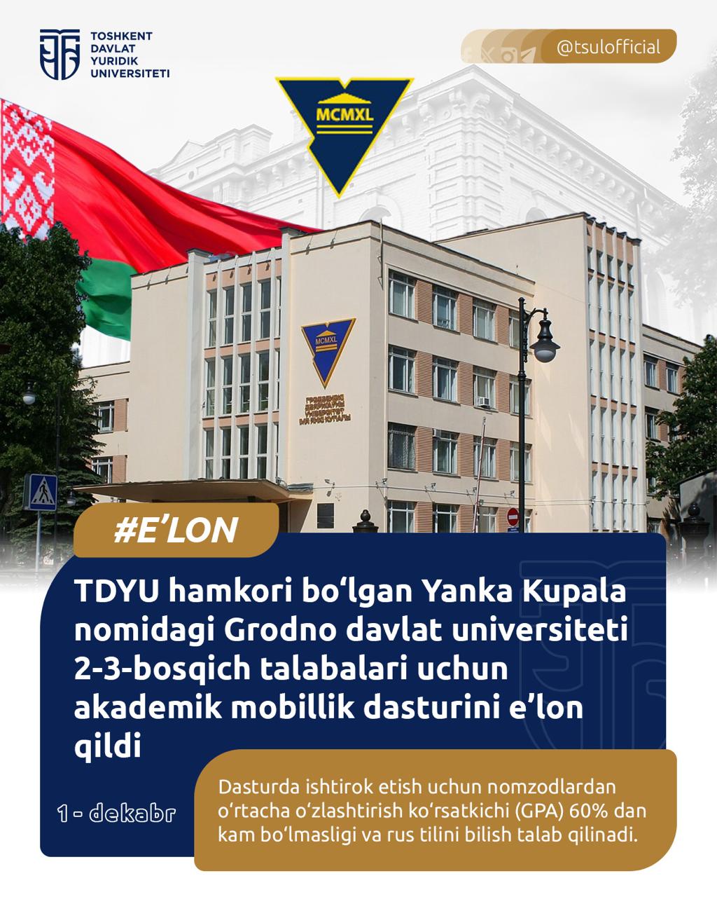 Xorijiy oliy ta’lim muassasasida talabalar almashinuv dasturi bo‘yicha o‘qishni istagan talabalar quyidagi hujjatlarni 10-noyabrga qadar dekanatlarga taqdim etishi lozim: